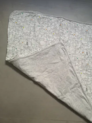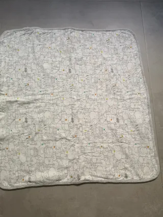 ¡Preciosa mantita para bebé con un diseño súper dulce! Ideal para capazo, minicuna o para llevar en el carrito. -Estampado: Dibujos de animalitos de la granja (ovejas, caballos, pollitos) con onomatopeyas y pequeños detalles en color. -Diseño: Doble cara. Por un lado tiene el estampado y por el otro es de color gris vigoré liso, muy suave al tacto. -Medidas: 60 x 64 cm aproximadamente (tamaño ideal para arrullo o paseo). -Estado: En muy buen estado, bien cuidada. Es una manta ligera pero amorosa, perfecta para entretiempo o para mantener al bebé cómodo en interiores.