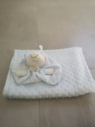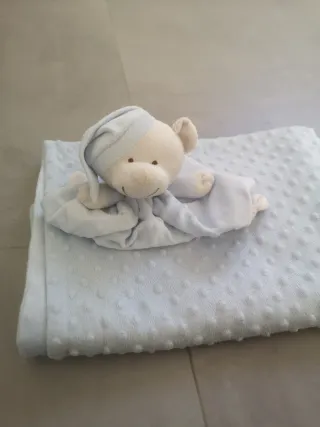 Precioso conjunto para bebé en color azul celeste pastel. Ideal para carrito, cuna o para arrullar al recién nacido. El tejido es extremadamente suave y agradable al tacto. -Manta: Con relieve de burbujas/puntitos (tipo minky) por una cara y tejido liso aterciopelado por la otra. -Medidas: 100 x 77 cm. -Dou Dou: Peluche de osito con gorrito de dormir, unido a una mantita de apego a juego. Muy blandito y seguro para el bebé. -Estado: Como nuevo, muy poco uso. Sin manchas ni roces. Perfecto como regalo de nacimiento o para tener una manta extra de calidad en el coche.