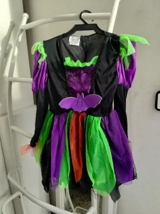 Disfraz de bruja para niña, perfecto para Halloween o fiestas temáticas. - Diseño de bruja con falda de tul. - Colores vibrantes: negro, morado, verde y naranja. - Incluye murciélago decorativo en el pecho.