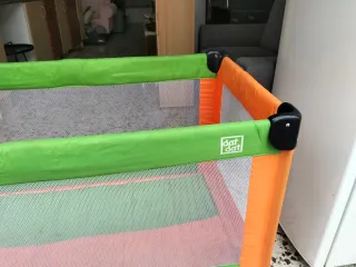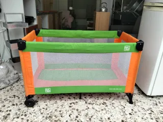 Práctica cuna de viaje plegable, ideal para transportar y usar en cualquier lugar. Su diseño es moderno y funcional. - Estructura de color naranja y verde. - Laterales de malla transpirable. - Ruedas para facilitar el desplazamiento.
