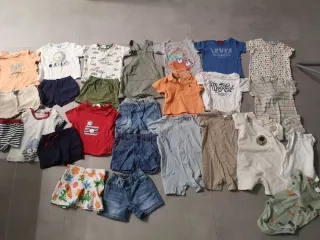 El lote incluye 20 prendas de tallas 6-12 meses: -5 Conjuntos completos (dos de ellos de Mayoral y uno de Losan). -3 Pantalones vaqueros: Estilo short, cómodos y versátiles. -1 Peto verde de H&M: Tela suave y fresca. -1 Body verde estampado: De H&M. -1 Polo naranja: Corte clásico. -3 Camisetas estampadas: Incluye una de Levi’s, una de Mayoral y otra básica. -2 Ranitas de Tex: Ideales para los días más calurosos. -3 Ranitas de H&M: Con diseños muy dulces (incluye la del osito). -1 Bañador Tribord: ¡Listo para la piscina o playa! Estado: Muy bueno / Bien cuidado. Puede haber por dentro un sello con el nombre de mi hijo.