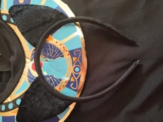 Disfraz de gato egipcio para niña, perfecto para fiestas o Carnaval. Incluye diadema, mono con cuello y cinturón. - Talla: 10-12 años (REF. 77724). - Diseño inspirado en el antiguo Egipto con detalles dorados y azules. - Mono completo con mangas largas y pantalón. - Cuello y cinturón a juego con el diseño. - Diadema con orejas de gato. - Marca: Fiestas Guirca. - Con ticket original de compra - Usado una sola vez