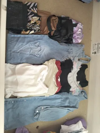 Conjunto de ropa para niña en talla 134-140. - Variedad de prendas. - Estilo moderno y cómodo. - 4 faldas polipiel - 2 pantalones - 6 camisetas de manga larga - 1 pero vaquero - 1 vestido Camisero.