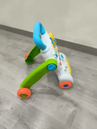 Correpasillos de actividades con divertidas figuras de colores y sonidos. - Mango azul para sujetarse. - Ruedas verdes y naranjas. - Panel con engranajes y botones. - Figura frontal con cara sonriente.