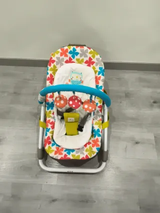 Hamaquita para bebé con un alegre diseño de flores multicolores. Es cómoda y segura para los más pequeños. - Estructura metálica. - Tejido acolchado con estampado floral. - Incluye arco de juegos con peluches. - Arnés de seguridad. Lo único que tiene son esas letras desgastadas por lo demás perfecta y recién lavada para su venta