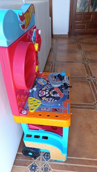 Mesa de taller de la marca Hot Wheels, ideal para los pequeños mecánicos. Presenta un diseño colorido y divertido. Tiene los tipicos desperfectos del uso. - Incluye accesorios como herramientas y piezas. - Estructura de plástico resistente. - Ruedas para facilitar su movilidad.