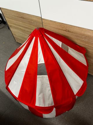 Divertida carpa de circo para niños, con un diseño llamativo de rayas rojas y blancas. - Estructura de tela. - Ventanas de malla.