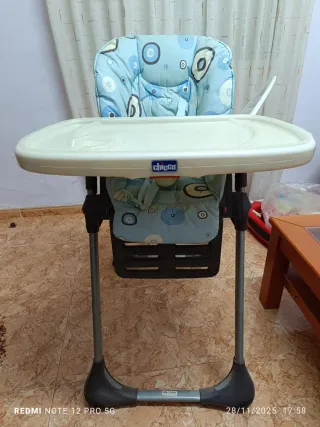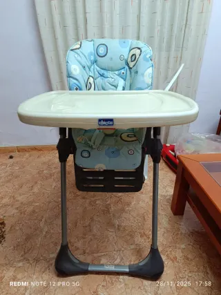 Silla de comer para bebés de la marca Chicco. - Diseño acolchado con estampado de círculos. - Bandeja desmontable. - Estructura metálica y base de plástico.
