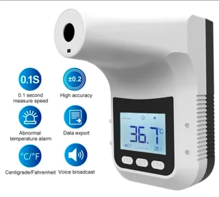 Termómetro K3 Pro infrarrojo automático sin contacto. Precio normal 88€ und. -3 unidades en liquidacion, nuevos a estrenar Termómetro K3PRO infrarrojo automático sin contacto, con voz, de pared o soporte trípode no incluido. La más alta tecnología para una medición rápida y precisa de la temperatura corporal. En menos de un segundo mostrará la temperatura; dispone de un gran display LED para una lectura clara. Si detecta fiebre anormal saltará una alarma y emitirá una luz roja. Si la temperatura es normal emitirá una luz verde. Volumen ajustable. Tripode-soporte no incluido. Disponemos de tripodes.