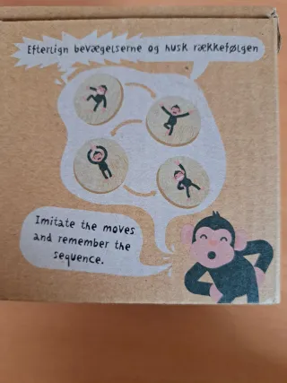 Juego de mesa para imitar movimientos y recordar secuencias. - 12 tarjetas de madera. - Ilustraciones de monos realizando diferentes posturas. - Ideal para entrenar la imitación y la memoria.