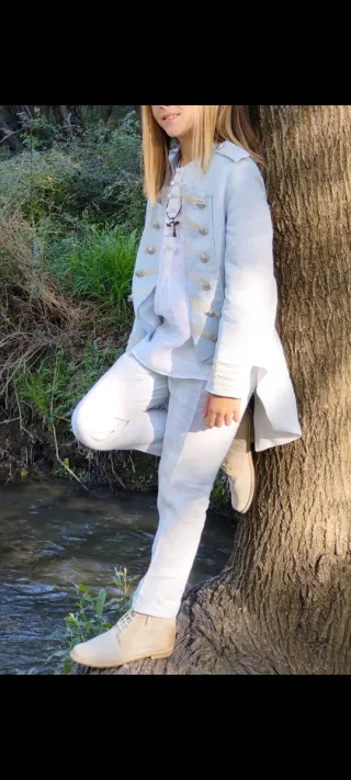 Conjunto de traje de comunión para niño, elegante y distinguido. - Levita celeste estilo militar con detalles dorados. - Pantalón celeste a juego. - Camisa blanca. Todo de lino. Precioso, queda espectacular.