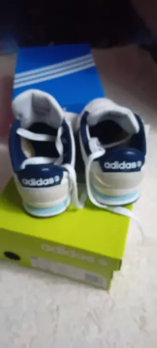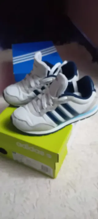 Zapatillas deportivas Adidas en color blanco con detalles en azul. - Diseño con las tres rayas características de la marca. - Cierre de cordones. - Suela de goma.