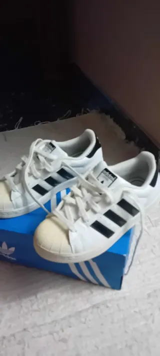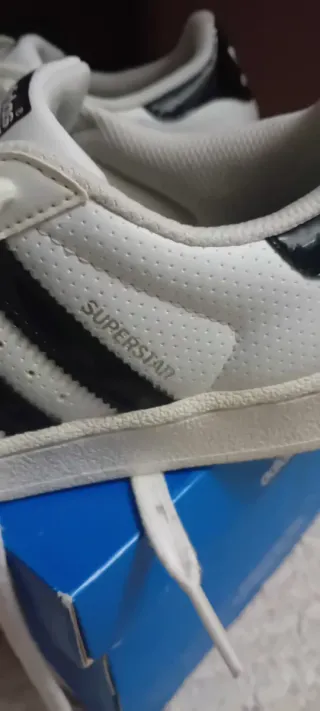 Zapatillas Adidas Superstar de color blanco con detalles en negro. Un clásico del streetwear. - Diseño icónico con las tres franjas. - Puntera de goma. - Cierre con cordones.