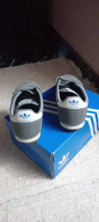 Zapatillas deportivas Adidas de color gris con cierre de velcro. - Tres rayas blancas laterales. - Suela de goma marrón. - Cierre de tres velcros.