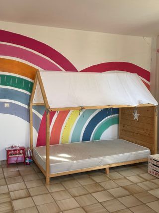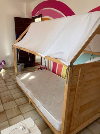 Cama estilo casita Montessori, ideal para fomentar la autonomía. Color : Madera natural, medida de colchón : 105 x 200 cm Cartel personalizado Nombre a Inés pero podemos remover. Colchón Classic - medida de colchón : 105 x 200 cm Tejado Cama casita - Tamaño de casita : 105 x 200 cm, Tela tejado : Loneta blanca - Estructura de madera. - Incluye somier. - Cabecero de madera. pagué 500€ por ello