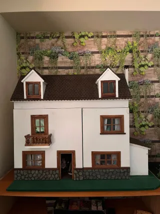 Casita de muñecas de madera con un diseño detallado y espaciosa. Sus dimensiones son 67cm de alto, 81cm de ancho y 28cm de fondo. - Construcción robusta de madera. - Fachada blanca con detalles en madera oscura. - Tejado a dos aguas con buhardillas. - Balcón decorativo en la planta superior. - Base con acabado de césped artificial.