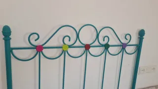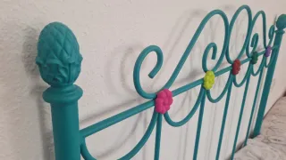 Cabecero de cama de estilo infantil con un bonito diseño. - Color turquesa. - Adornos de flores de colores. - Remate superior con forma de piña.