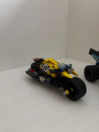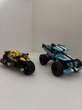 Set de construcción Lego con un coche y una moto de carreras. - Coche de carreras azul y negro con detalles blancos. - Moto de carreras amarilla y negra con el número 8.