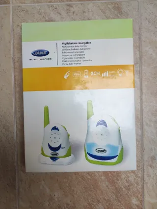 Vigilabebés recargable de la marca Jane Electronics. Incluye unidad de bebé y unidad de padres. - Diseño compacto y moderno. - Indicador de nivel de sonido. - Alcance de hasta 250 metros.