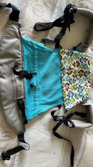 Mochila de porteo Buzzidil XL con un divertido estampado de monos. - Diseño ergonómico. - Capucha con estampado. - Tirantes acolchados. Desde 3,5 hasta los 18 kg. No tengo caja, pero tengo una funda para transportarla.