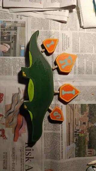 Se puede personalizar al gusto tanto de color y de nombre (el de la foto es un ejemplo) para más información envíame un mensaje Juguete artesanal con forma de dinosaurio, ideal para el aprendizaje Montessori. Cada pieza está pintada a mano con detalles únicos. - Diseño de dinosaurio con placas. - Colores verde y naranja. - Letras y símbolos en las placas.