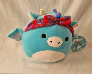 Peluche Squishmallows Tatiana la Dragona de Jazwares/Kellytoy. Dragón ultra suave y squishy en azul turquesa vibrante, con cuernitos cremosos, alas plateadas brillantes y un lazo bandana rojo-púrpura con estampado psicodélico. [20Cm]