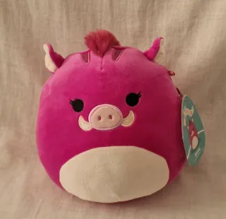 Peluche Squishmallows Jenna el Jabalí (Warthog) de Jazwares/Kellytoy. Jabalí ultra suave y squishy en rosa fucsia vibrante, con colmillos curvos beige, hocico rosado detallado, pestañas largas coquetas y moño fluffy rosado. [20Cm]