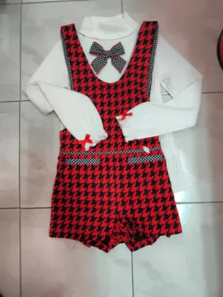 Conjunto de dos piezas para niña, talla 10 años. Incluye un mono corto con estampado de pata de gallo en rojo y negro, y un jersey blanco de cuello alto. - Mono corto con tirantes y detalles de lazo. - Jersey de manga larga con cuello alto. - Estampado de pata de gallo en el mono.