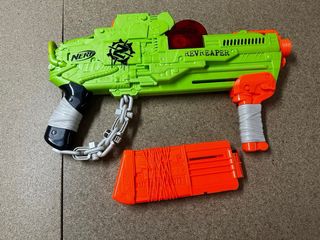 Pistola de juguete Nerf Revreaper en llamativos colores verde y naranja. - Incluye cargador. - Diseño distintivo. - Cadena decorativa en el mango.