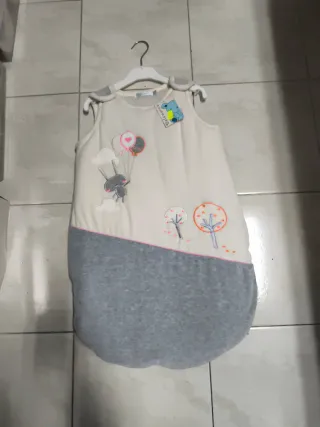Saco acolchado para bebé con un diseño tierno y divertido. - Parte superior en color crema con apliques de nubes, globos y un elefantito. - Parte inferior en color gris. - Ribete decorativo en color rosa. - Cierre de cremallera lateral y en el hombro.