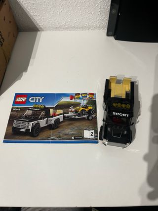 Conjunto de vehículos de Lego City. Con instrucciones. - Camión de basura naranja. - Tren azul con vagón. - Camión de policía blanco y azul. - Helicóptero de correos. - Quad amarillo. - Coche de bomberos. -Coche pequeño amarillo.