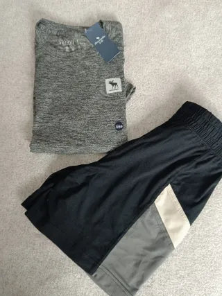 Conjunto de camiseta y pantalón corto de Abercrombie & Fitch. - Camiseta gris jaspeado con logo. - Pantalón corto negro con detalles grises y beige.
