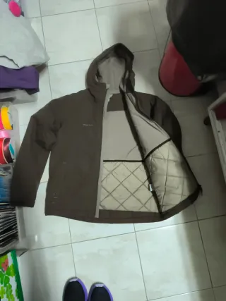 Chaqueta de la marca Quechua en color verde militar. - Talla 14 años. - Diseño con capucha. - Cierre de cremallera.
