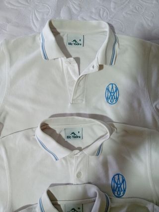 Dos polos de manga corta, uniforme del colegio Carmen Sallés. - Logo del colegio bordado en azul. - Cuello tipo polo con botones. - Mangas cortas. - Etiqueta interior con marca 'Mc Yadra' y talla 10 y el otro es talla 8