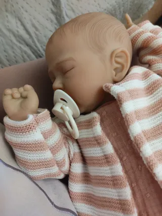 Muñeca realista de bebé, con detalles muy cuidados. - Extremidades de vinilo muy suave y cuerpo de tela - Pelo pintado - Ojos cerrados.