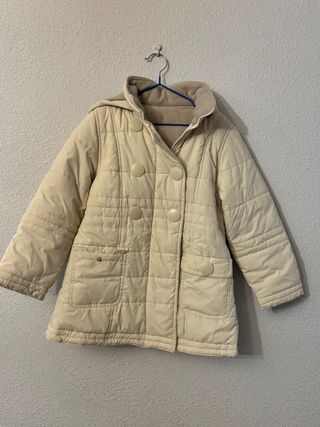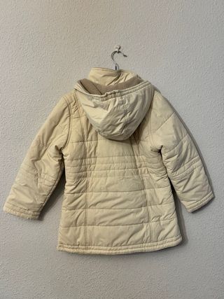 Abrigo acolchado para niña en color marfil, ideal para el frío. - Diseño acolchado. - Cierre de botones y cremallera. - Bolsillos frontales. - Capucha.