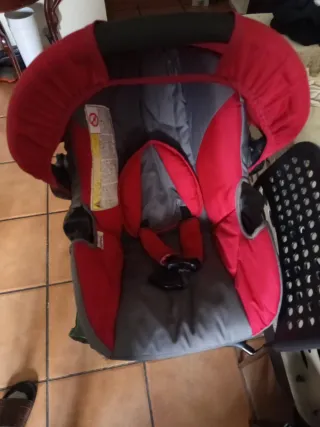 Silla de coche para bebé en buen estado, lista para su próximo uso. Diseñada para la seguridad y comodidad. - Tapicería en color rojo y gris. - Sistema de arnés de seguridad.