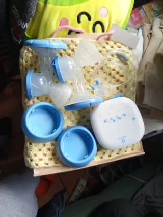 Extractor de leche eléctrico con todos sus accesorios. - Incluye motor, embudos, tubos y recipientes. - Diseño compacto y portátil.
