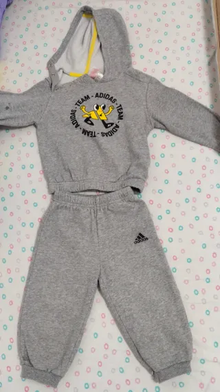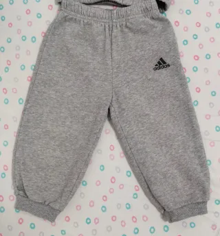 Conjunto de chándal Adidas de dos piezas en color gris. - Sudadera con capucha y estampado. - Pantalón largo con cintura elástica. - Logo de Adidas en el pantalón.