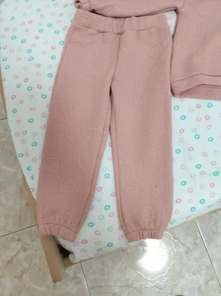 Conjunto de dos piezas para niña de la marca Mayoral. - Color rosa palo. - Estampado de corazones en relieve. - Sudadera con cuello redondo y puños. - Pantalón con cintura elástica y puños.
