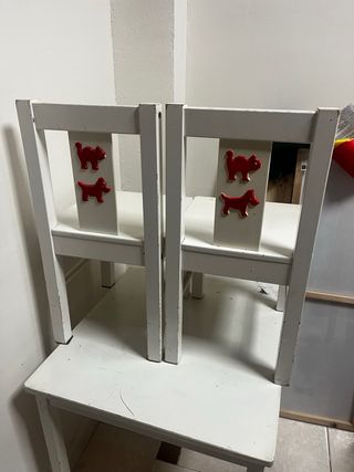 Conjunto de mesa infantil con dos sillas a juego, de IKEA. Ideal para que los más pequeños tengan su propio espacio. - Diseño blanco con detalles de perros rojos. - Sillas con respaldo decorado.