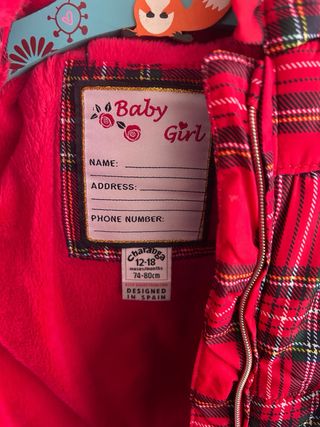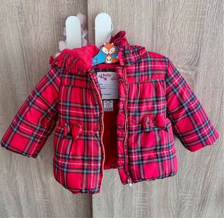 Chaqueta de bebé para niña con un bonito estampado de cuadros. - Diseño en color rojo con detalles en azul y verde. - Capucha con forro interior suave. - Adornos de lazo en los bolsillos. Pone 12/18 pero para una 9/12 yo creo que va bien!