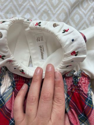 Conjunto de vestido para bebé con estampado de cuadros. - Cuerpo blanco de manga larga. - Falda con tirantes y cintura fruncida. - Cuello con detalle de volantes y estampado.
