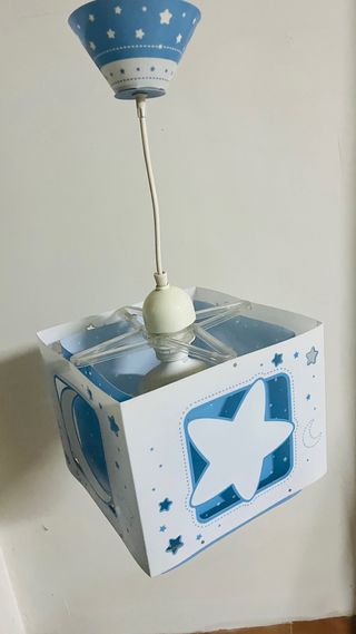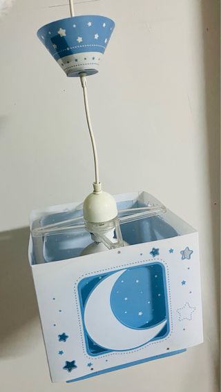 Lámpara de techo con un diseño encantador para la habitación de un bebé o niño. - Base azul con estrellas blancas. - Pantalla con forma cúbica y motivos de estrellas y lunas. - Estrellas blancas troqueladas en la pantalla.
