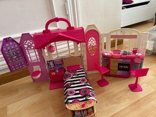 Casa de muñecas Barbie plegable que incluye cocina y habitación. - Diseño en color rosa. - Incluye accesorios de cocina y dormitorio. - Se pliega para facilitar su almacenamiento. Bicicleta Coche fiat Dentista Supermercado incluye barbie Coche moster hight Se venden por separado cada cosa a un precio segun lo que sea o todo junto por 75 euros
