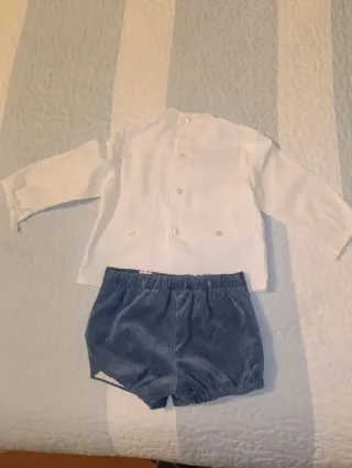 Conjunto de dos piezas para bebé, ideal para ocasiones especiales. - Camisa blanca de manga larga con detalles de puntilla azul. - Pantalón corto de pana azul. - Cierre de botón en la camisa.