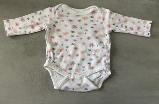 Body de manga larga para bebé con estampado de flores. - Base blanca. - Flores en tonos rosa y morado. - Cierre de broches en la parte inferior.