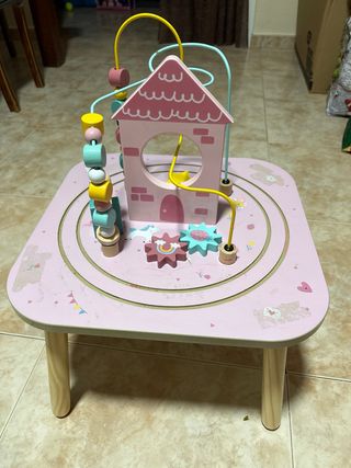 Mesa de juego de madera con temática de castillo de cuento de hadas, ideal para los más pequeños. - Diseño en color rosa con detalles de unicornios y fresas. - Incluye un laberinto de cuentas de colores en la parte superior. - Cuenta con figuras de madera como estrellas y nubes para interactuar. - Base con un circuito para mover piezas. Tiene algunos pintadas pero funciona perfectamente