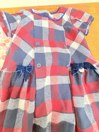 Vestido de la marca Mayoral. - Diseño de cuadros en tonos rojo, azul marino y blanco. - Detalle de lazos de terciopelo azul marino en los laterales. - Doble fila de botones en la parte delantera. Talla 9 meses