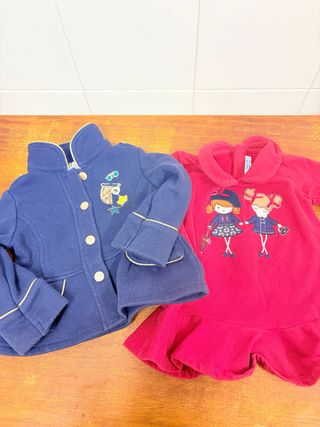 Conjunto de ropa infantil de la marca Mayoral. - Chaqueta azul marino con detalles dorados y bordado. - Vestido rojo con estampado de dos niñas y volantes.